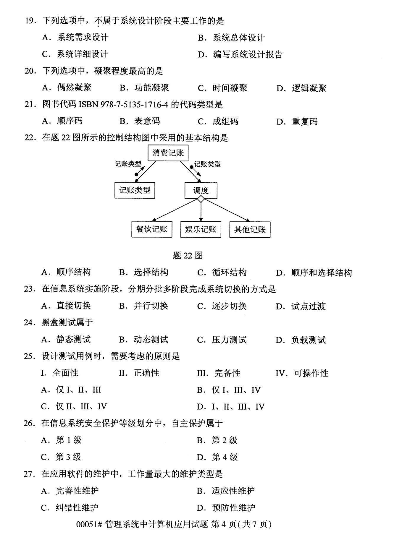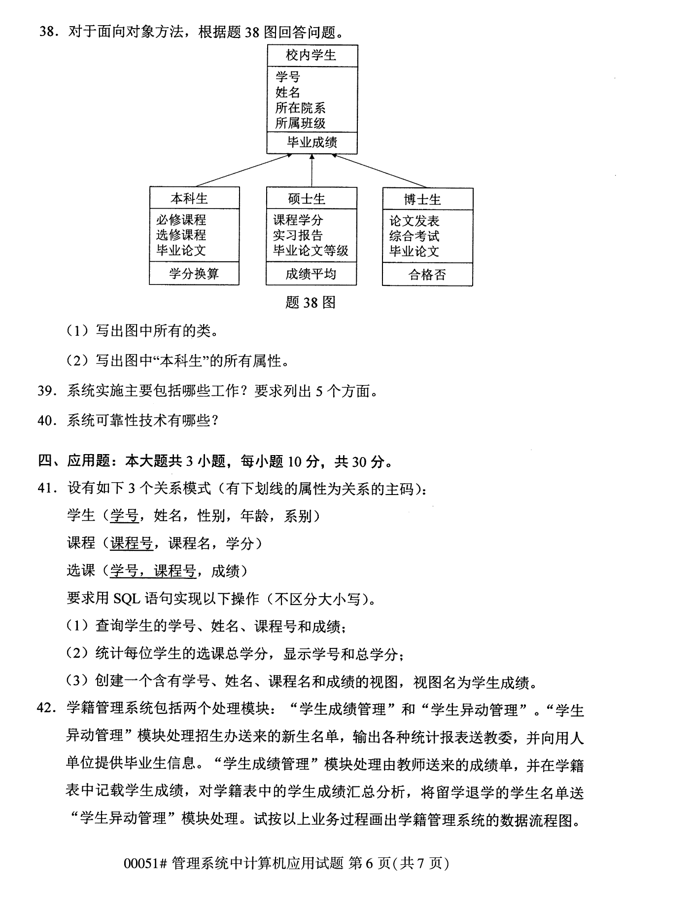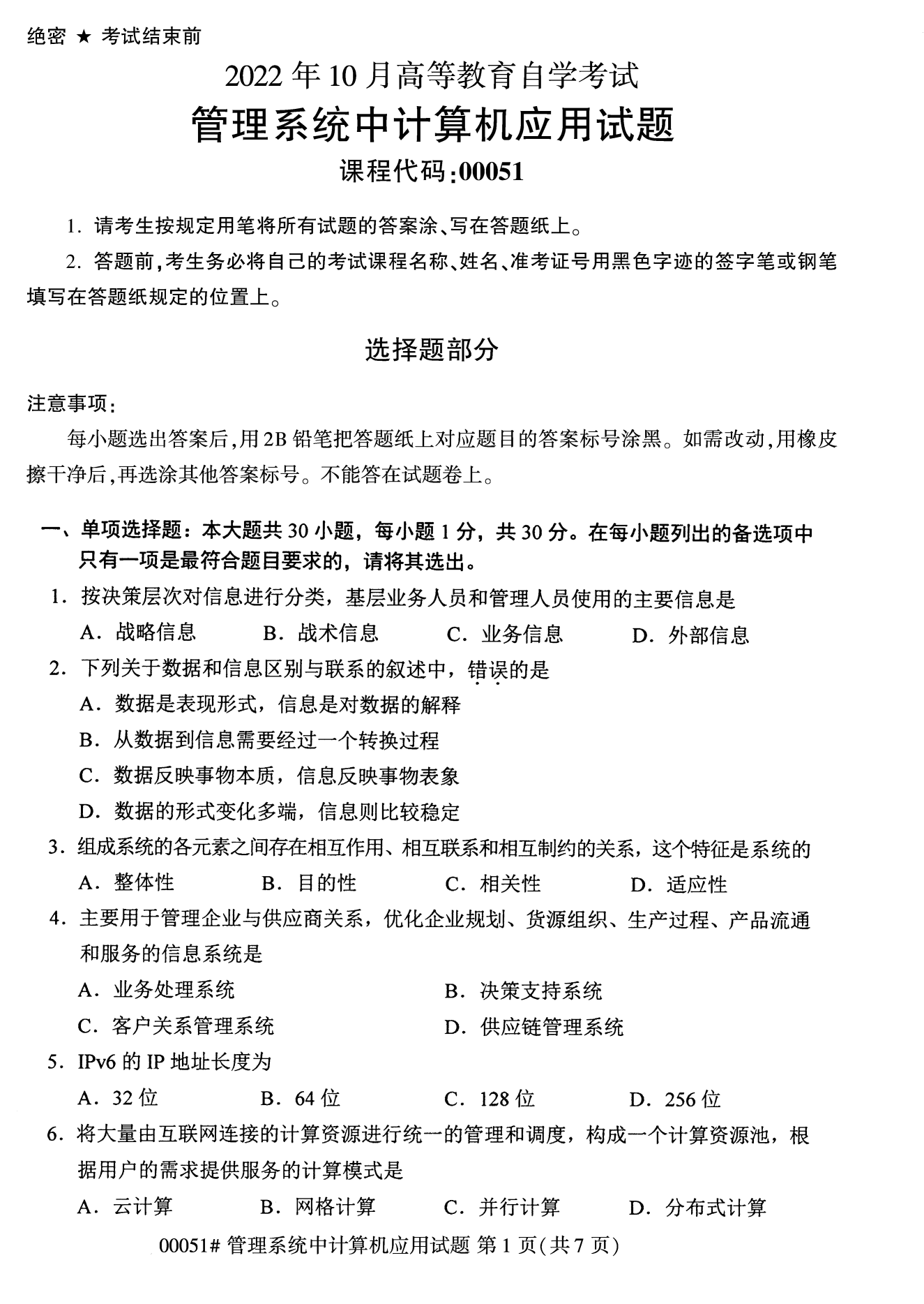 2022年10月高等教育自學考試管理系統中計算機應用00051試題