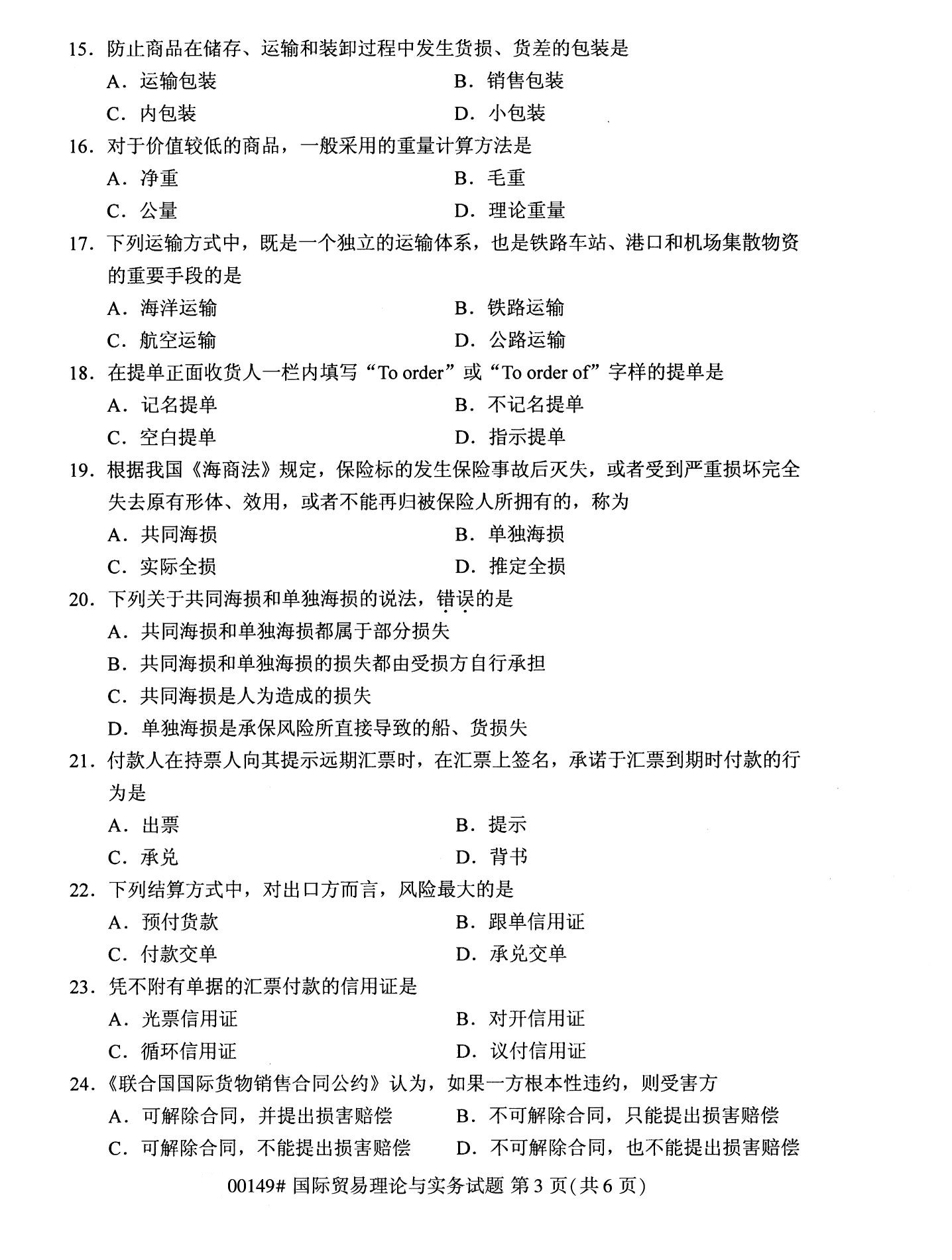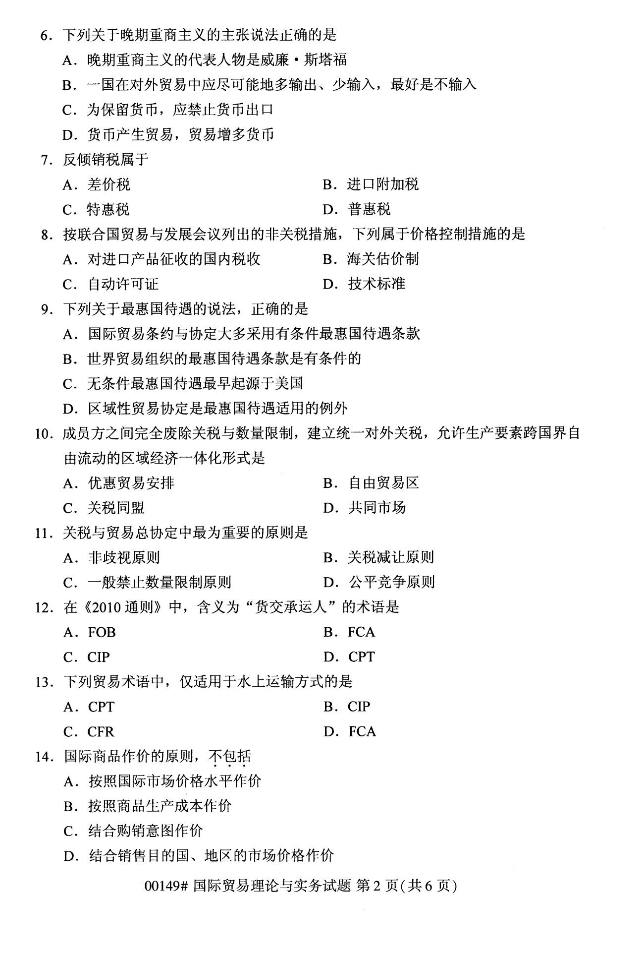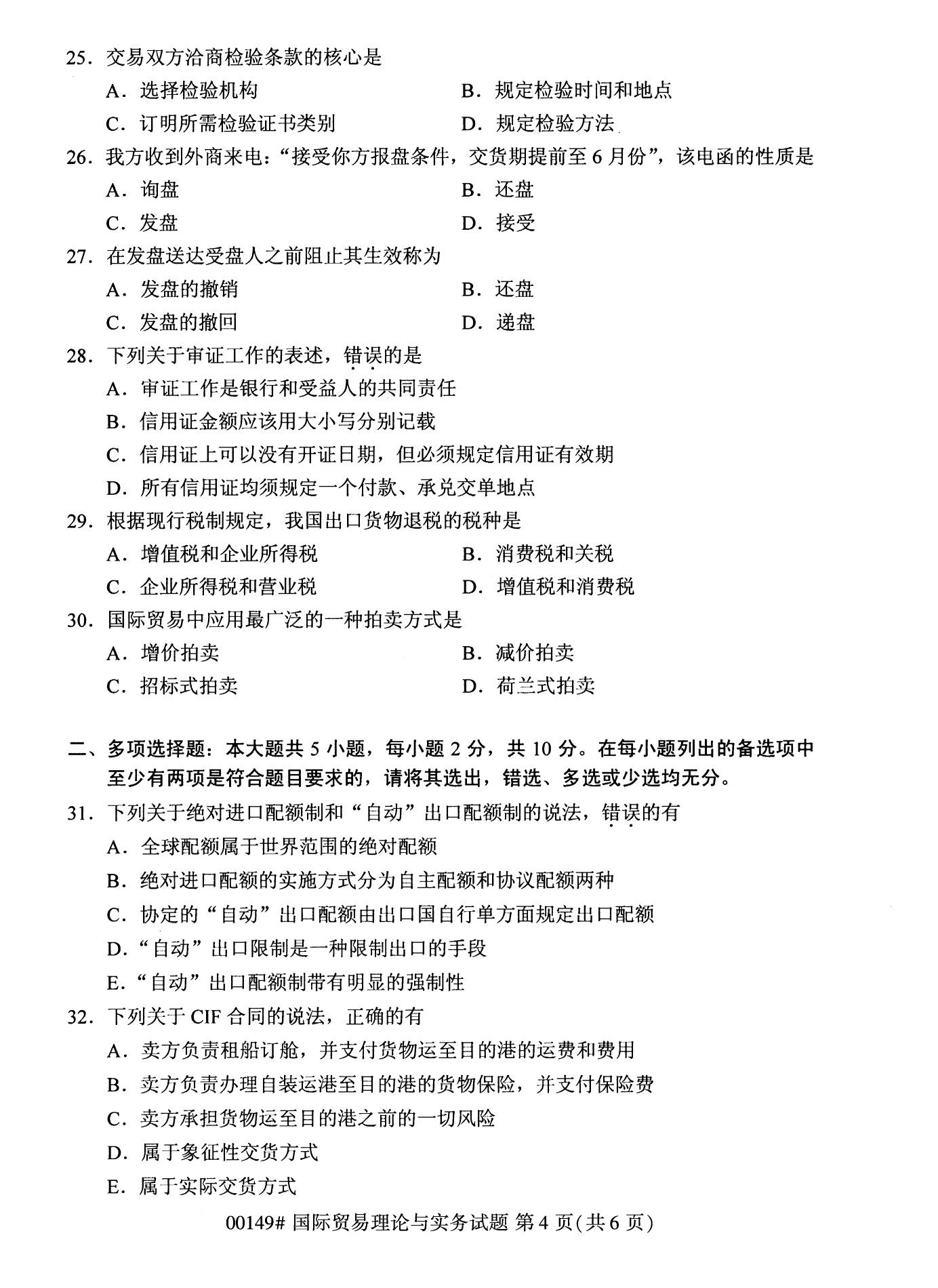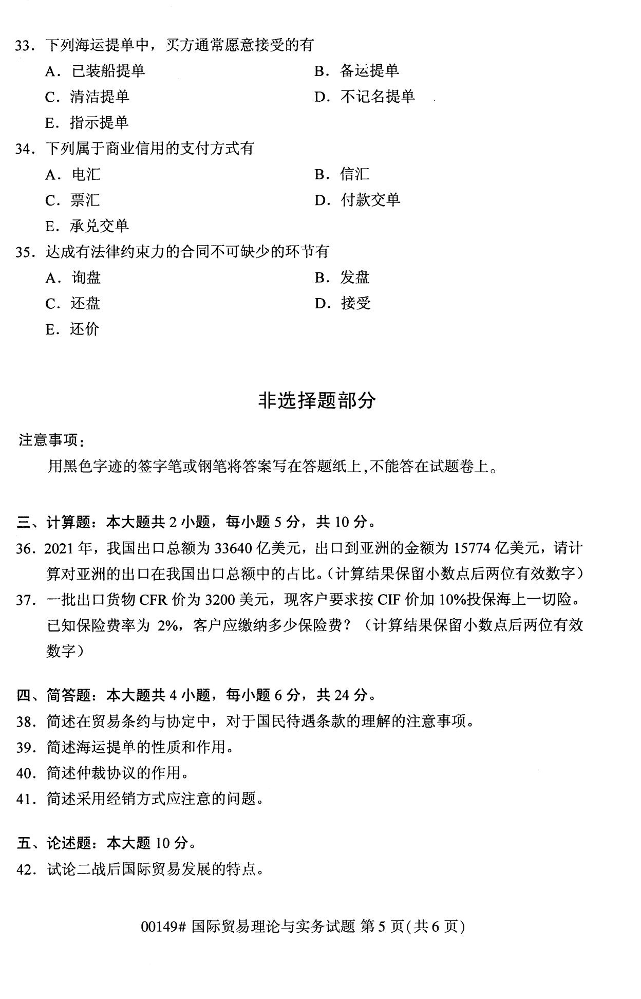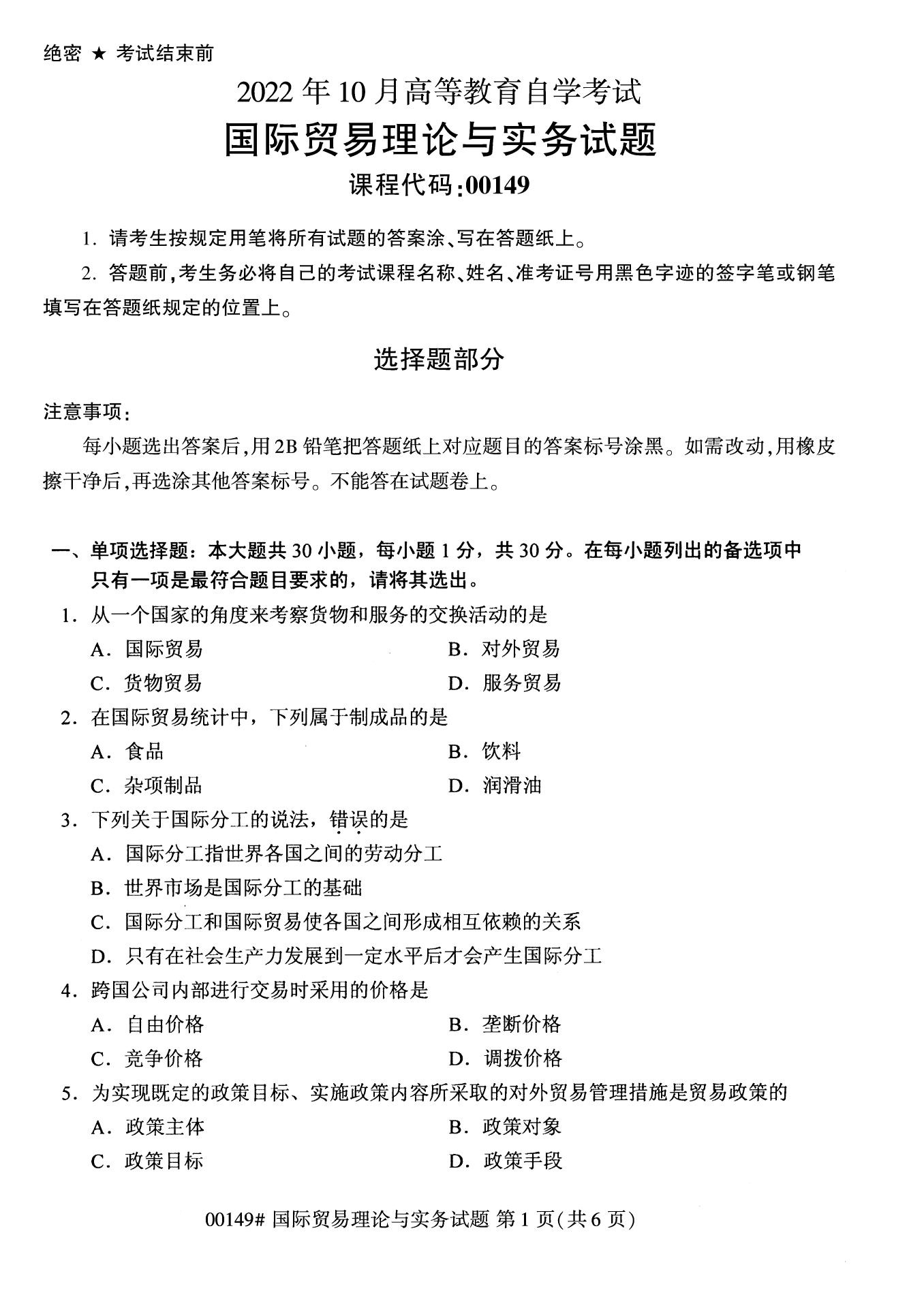 2022年10月高等教育自學考試國際貿易理論與實務00149試題