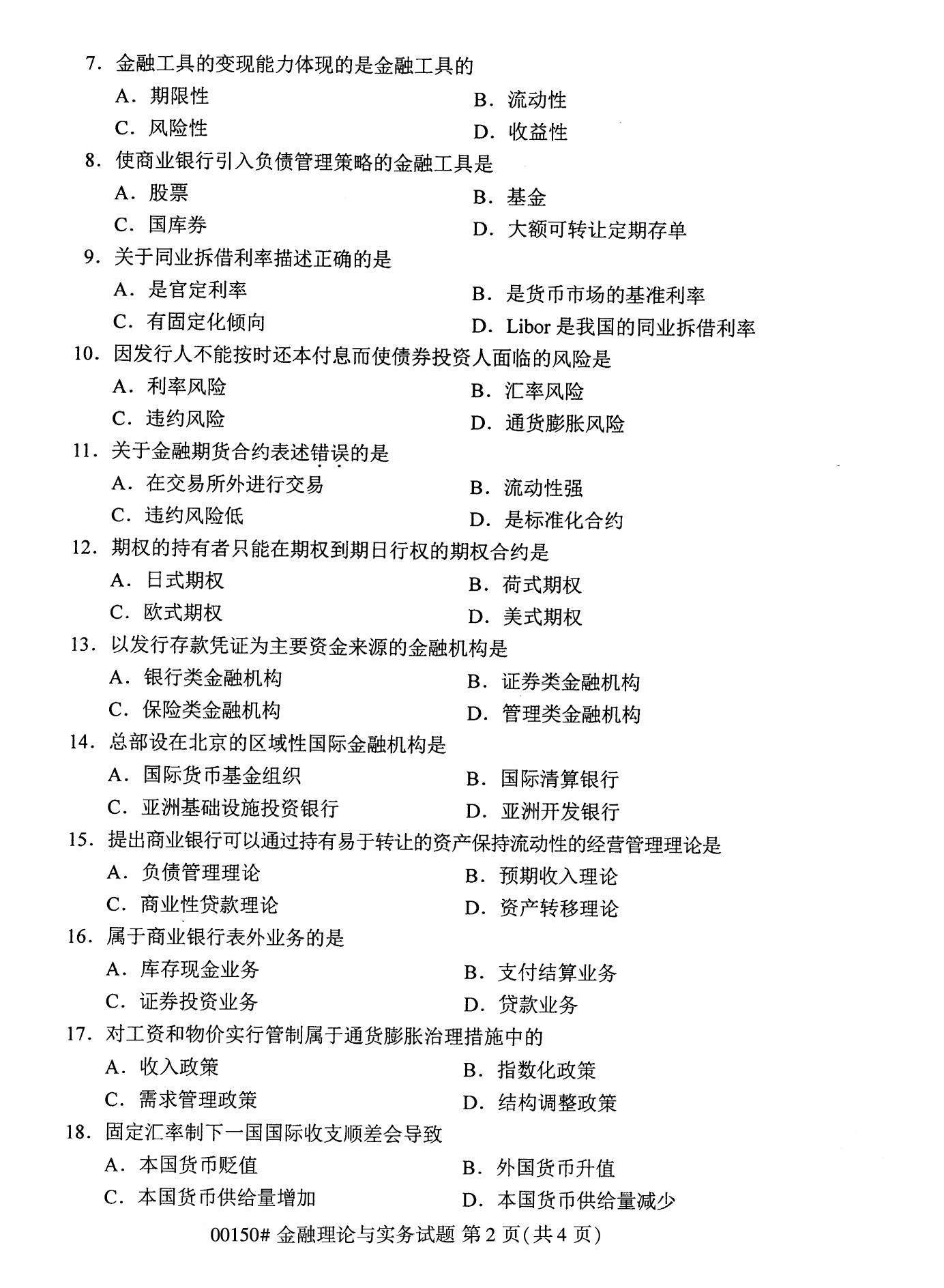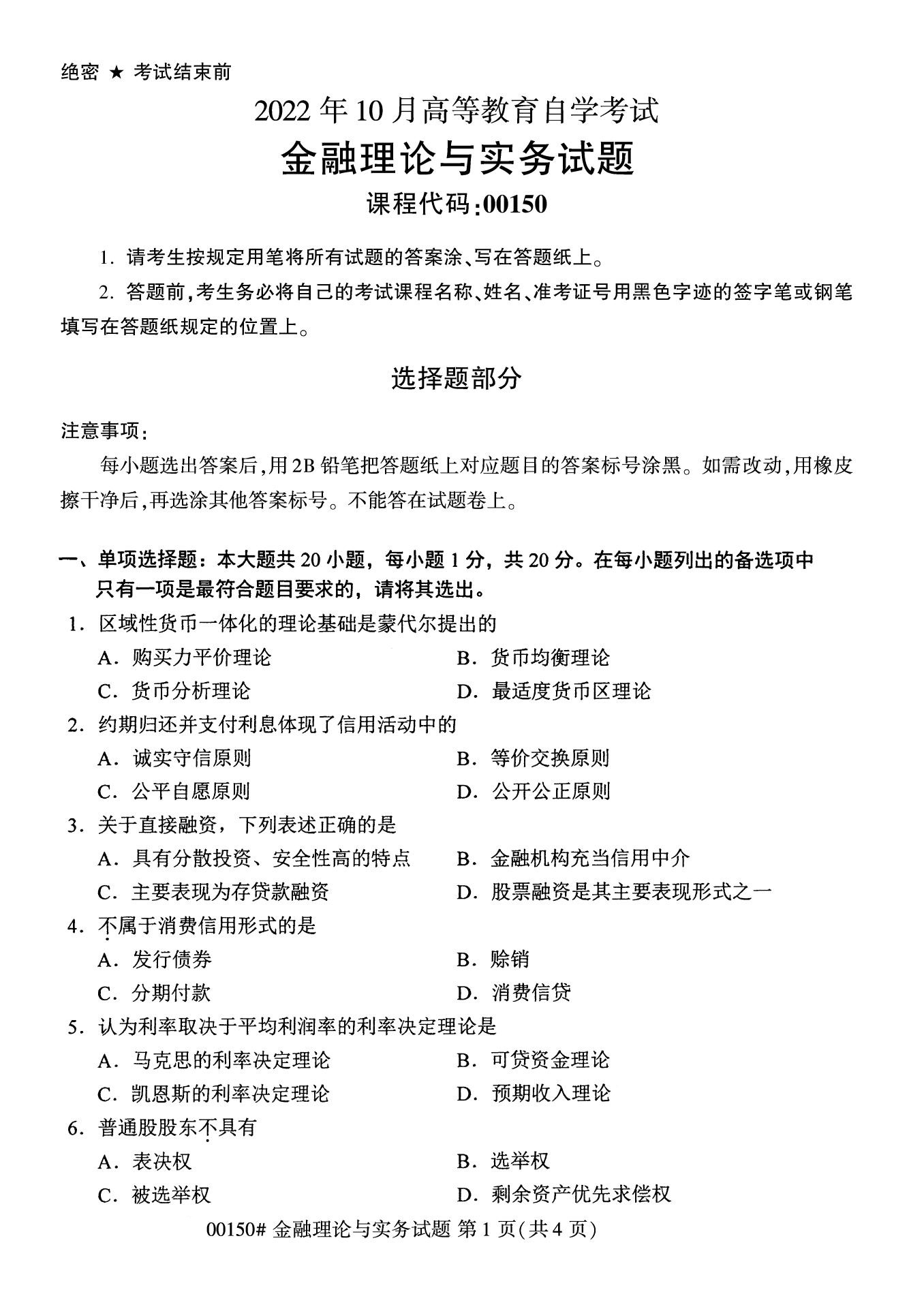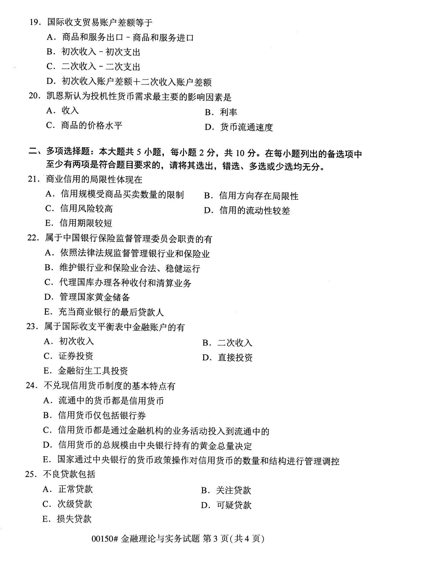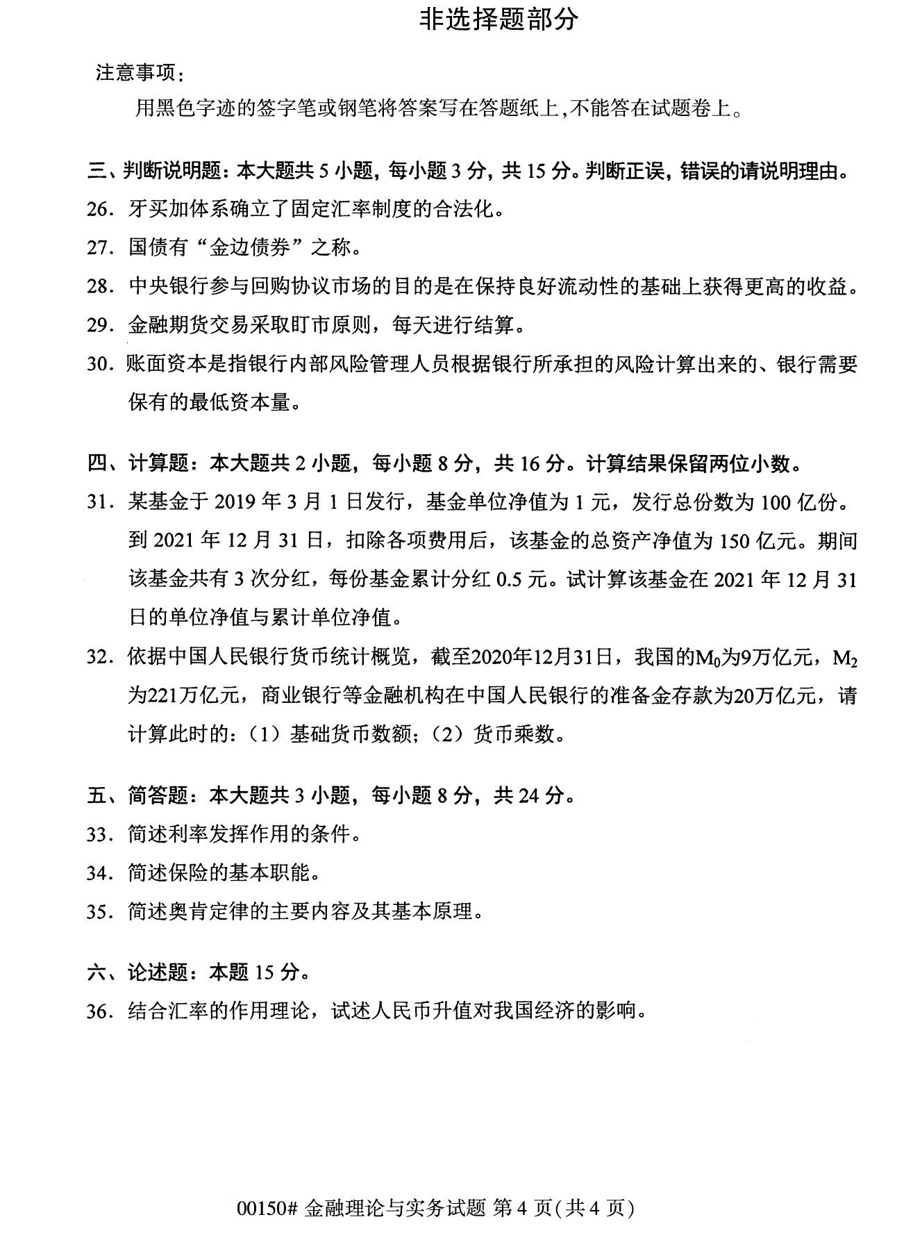 2022年10月高等教育自學考試金融理論與實務00150試題