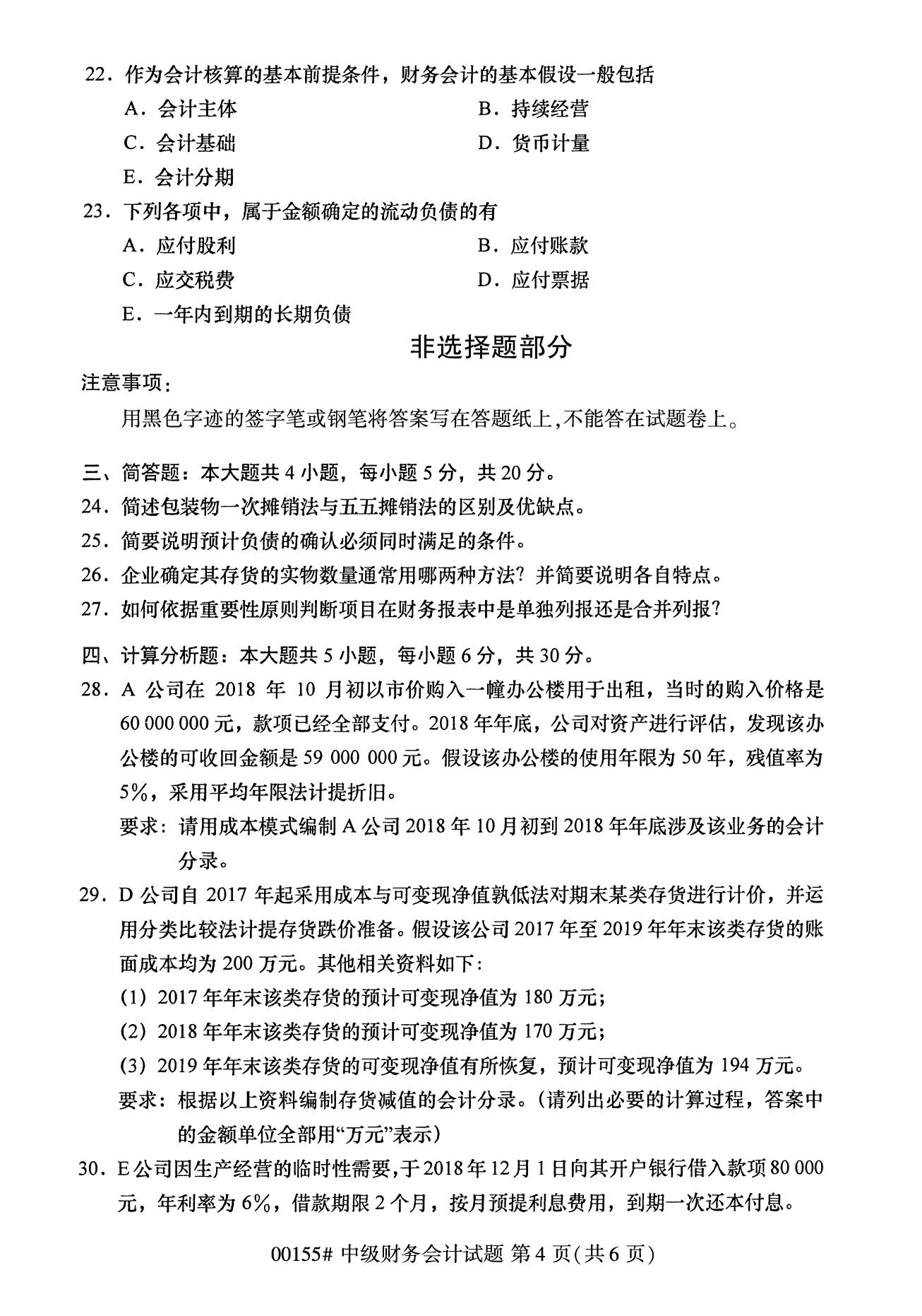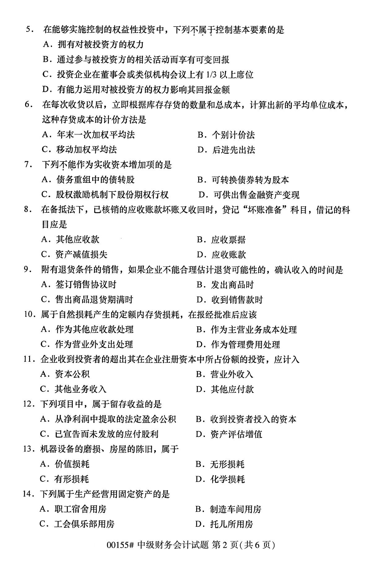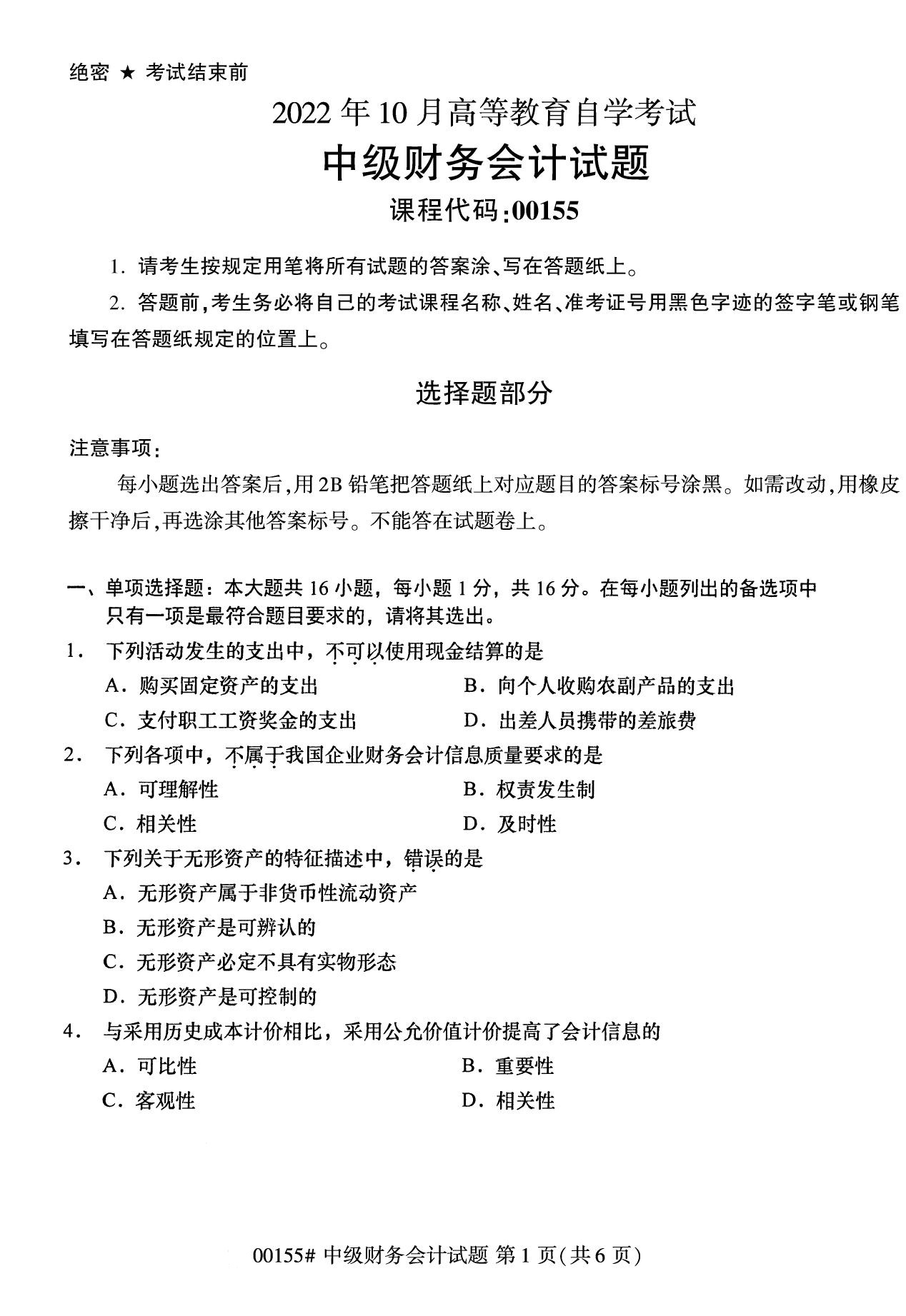 2022年10月高等教育自學(xué)考試中級(jí)財(cái)務(wù)會(huì)計(jì)00155試題