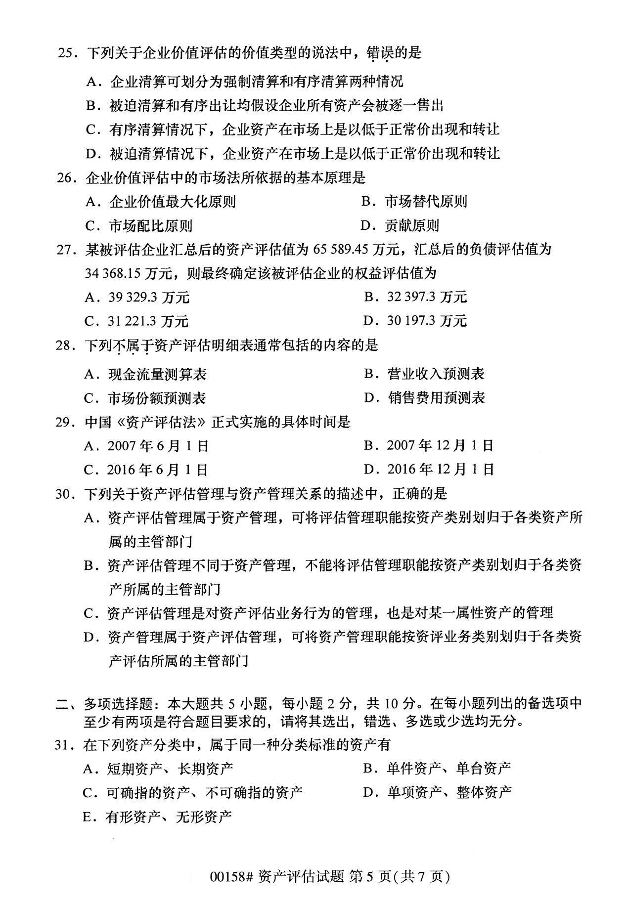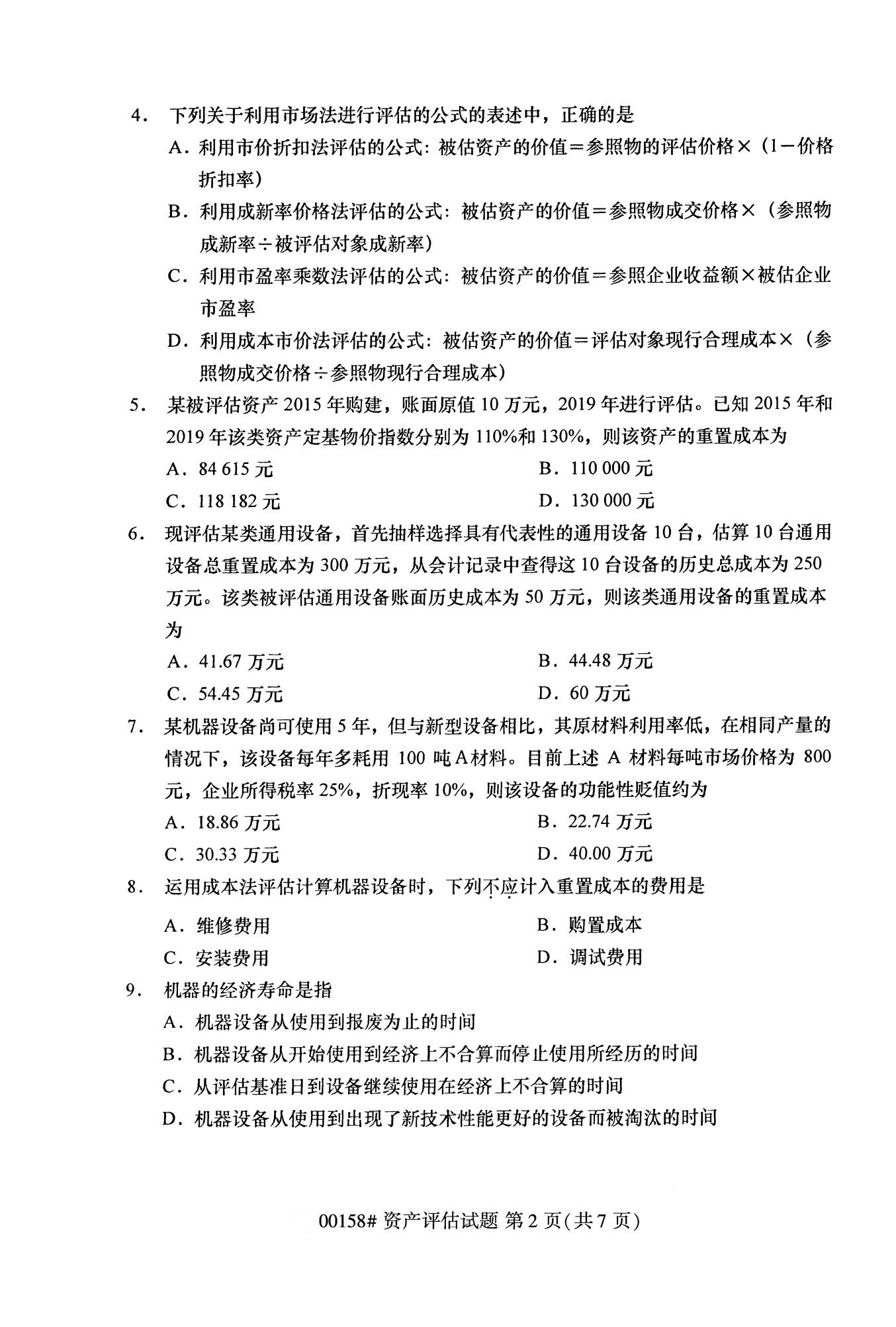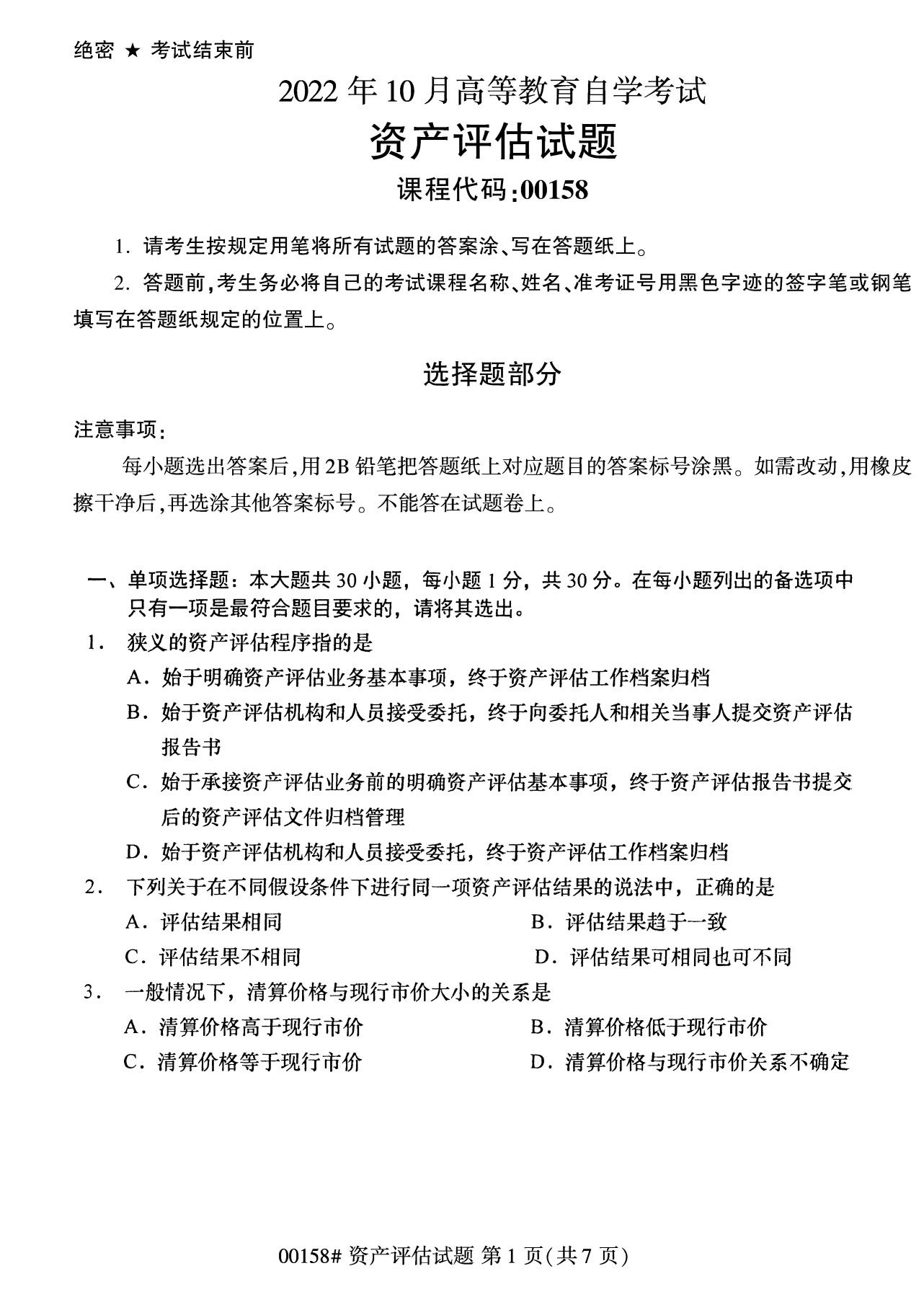 2022年10月高等教育自學考試資產評估00158試題
